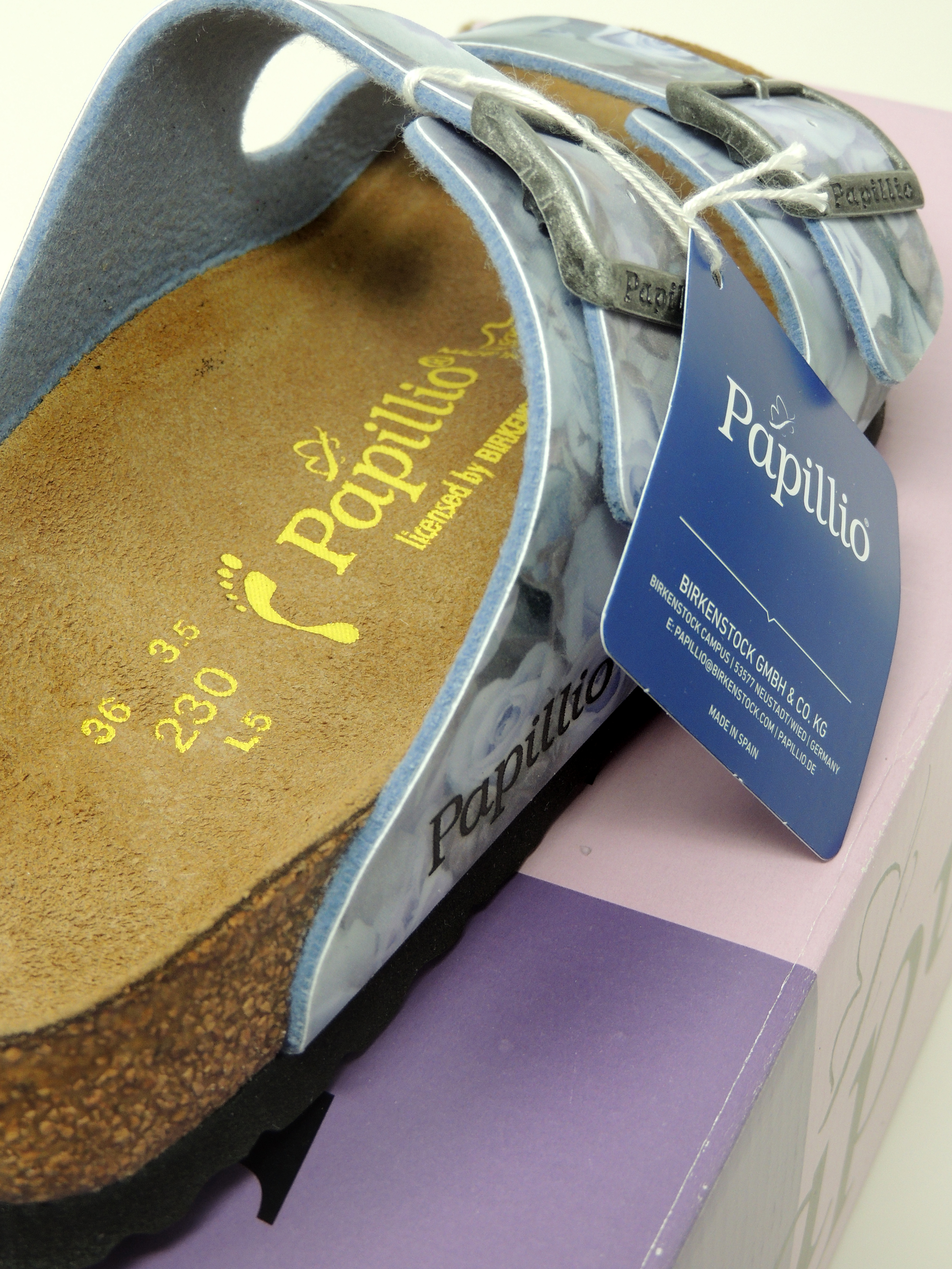 Left: a Papillio box. Right: a Papillio sandal. See how the footbed looks different and where the embossed "Birkenstock" has been replaced with an embossed "Papillio."
